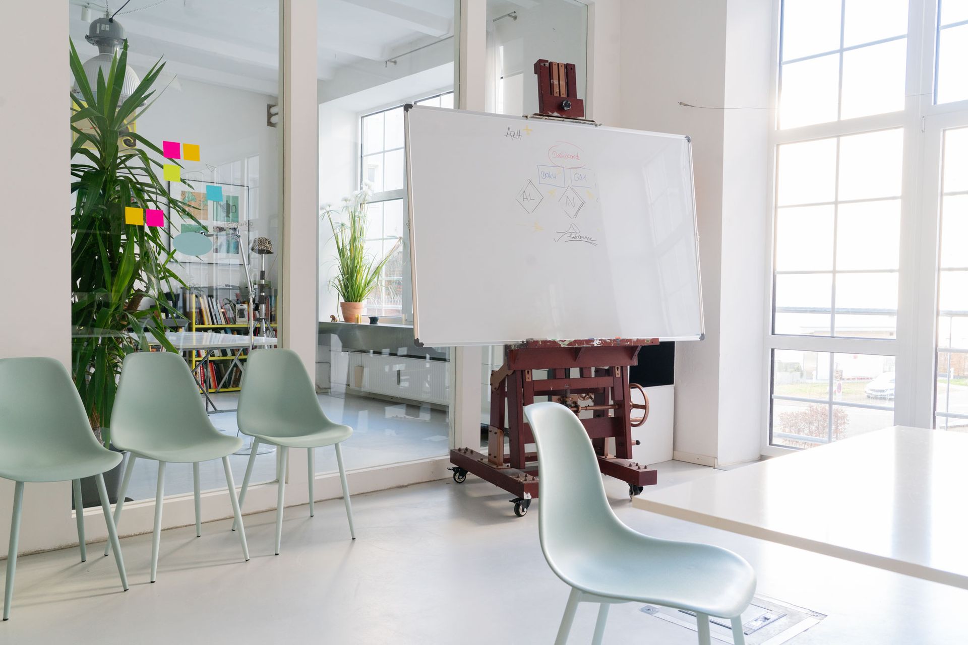 Wir haben natürlich Glasfaser-Anbindung. Stromanschlüsse sind durch Bodentanks flexibel im Raum verteilt, sodass Sie keine Stolperfallen durch Kabel haben. Ein großes mobiles Flipchart und ein 75 Zoll Präsentations-Screen sind Teil der Standardaussattung.