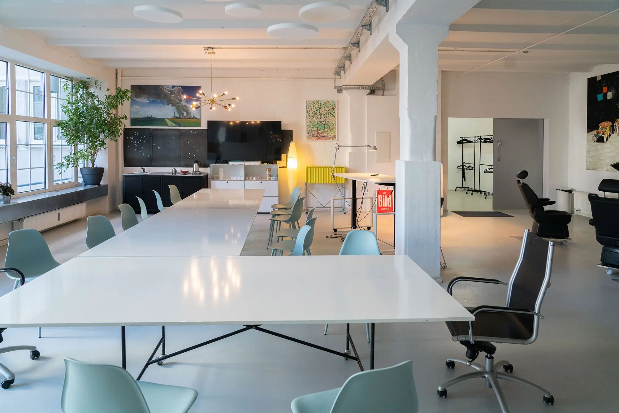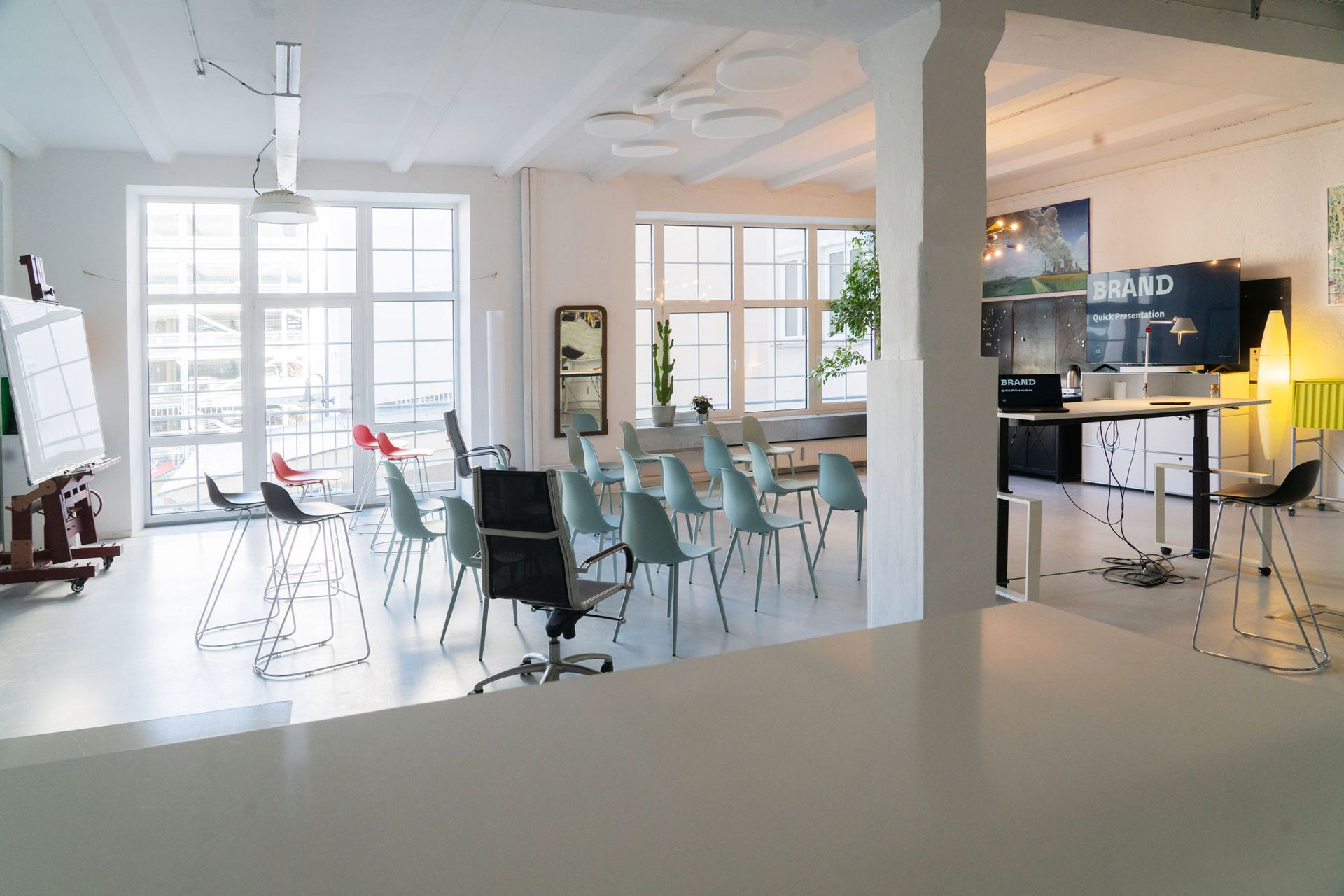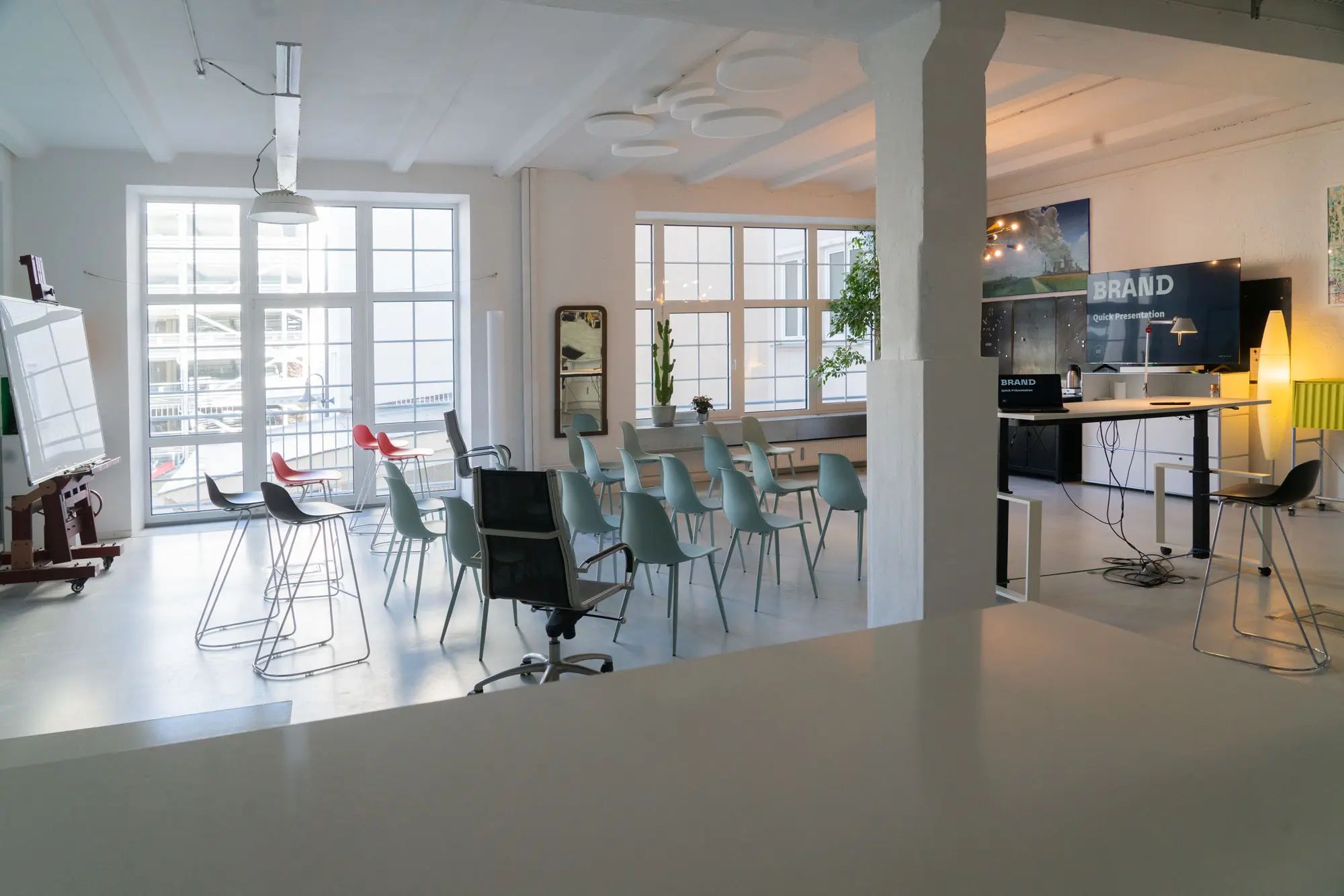 Definitiv. Durch die 3,65m hohen Decken und die breite Fensterfront haben Sie hervorragendes Tageslicht (abdunkelbar bei Bedarf). Der cleane Industrial-Look (weiße Wände, grauer Boden, Sichtbeton-Elemente) dient als perfekte, neutrale Leinwand für Shootings.